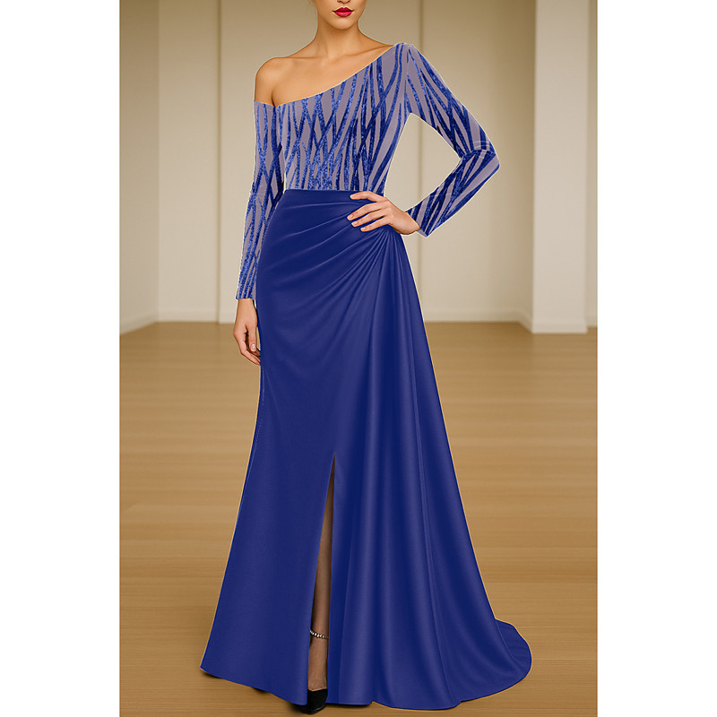 Mermaid Trumpet Floor Length Evening Gown Ball Gown with Overskirt Formal Dress Elegant Glittering Sparkle Long Sleeve One Shoulder Wedding Formal Stretch Satin Sequined with Glitter