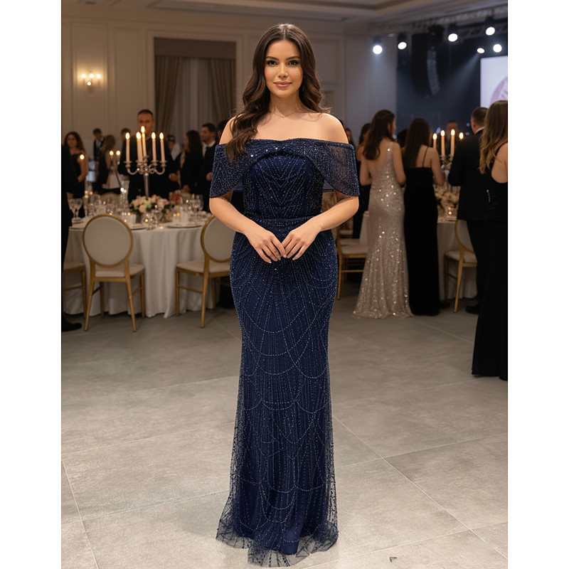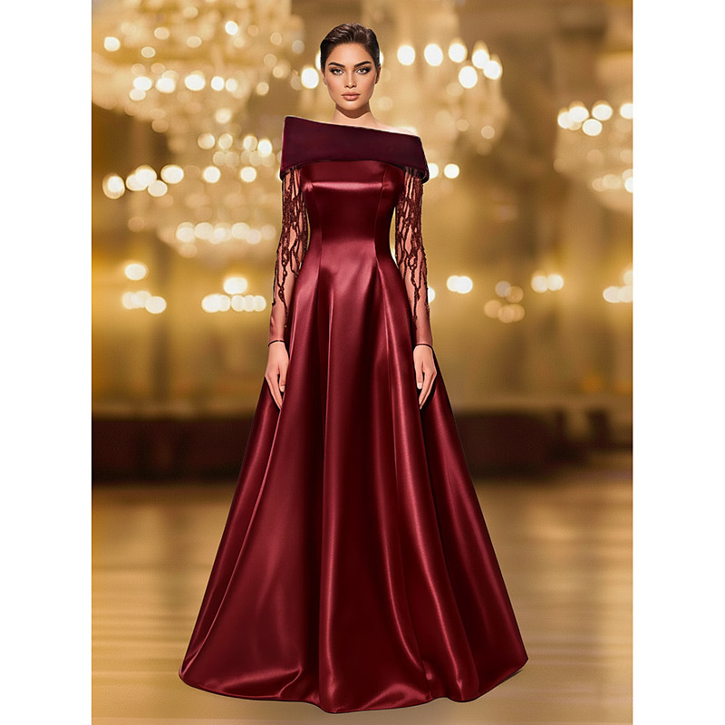 A-Line Floor Length Evening Gown Ball Gown Formal Dress Elegant Glittering Silky Long Sleeve Off Shoulder Wedding Formal Pocket Stretch Satin Velvet with Beading
