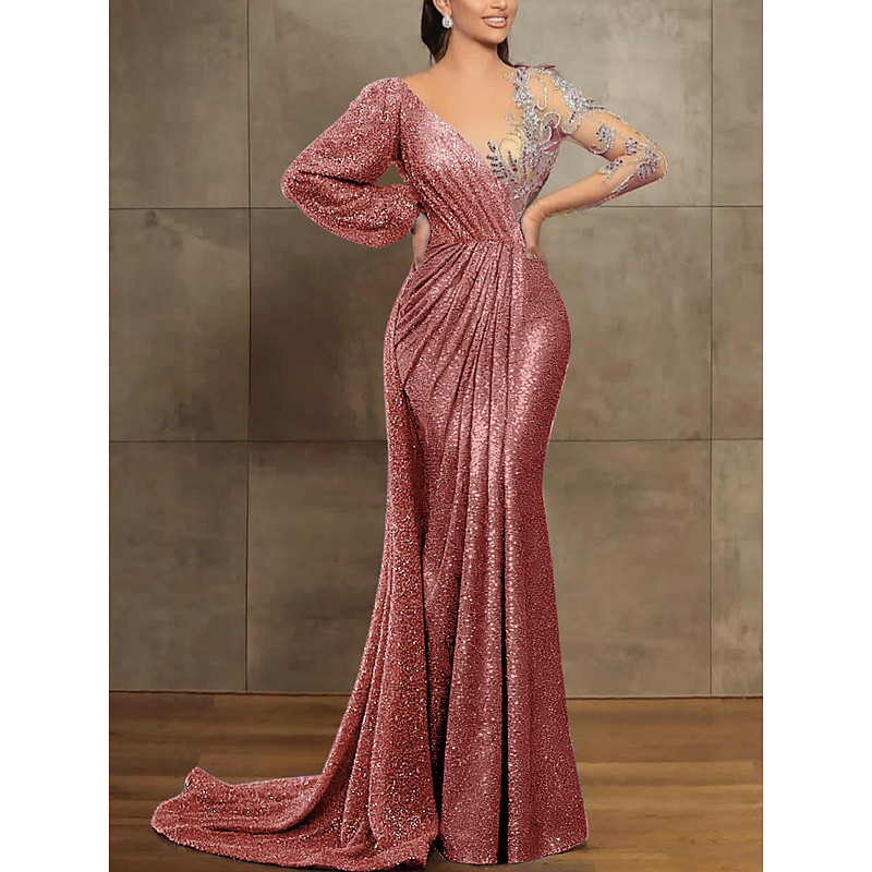 Mermaid Trumpet Court Train Evening Gown Ball Gown with Overskirt Formal Dress Elegant Long Sleeve Illusion Neck Formal Sequined with Pleats Sequin