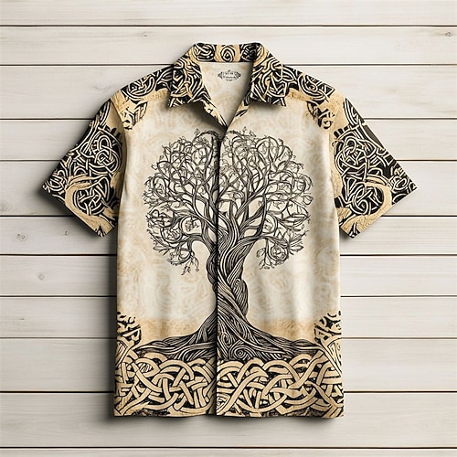 Herren Baum des Lebens Hemd Sommerhemd Freizeithemd Kurze Ärmel Hawaiianisch Lässig Resort Urlaub Alltagskleidung Ausgehen Sommer Revers Druck Dunkel Braun Braun Khaki