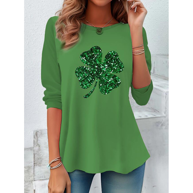 St. Patrick Women's T Shirt Shamrock Plants Casual Long Sleeve Crew Neck Regular Tops Daily Print Black White Green Spring Fall