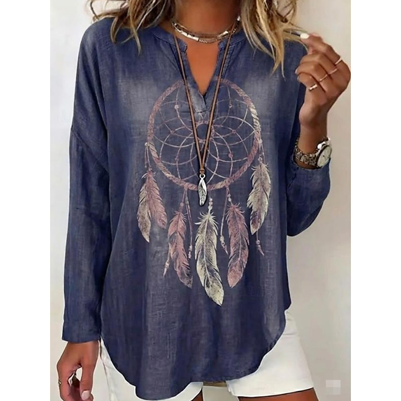 Women's Shirt Tunic Graphic Feather Bohemia Vintage Daily Long Sleeve V Neck Regular Tops Daily Holiday Print Navy Blue Summer Spring