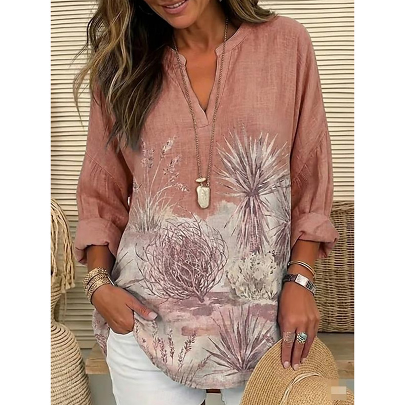 Women's Shirt Linen-Inspired Shirts Long Sleeve V Neck Red Green Gray Spring Fall