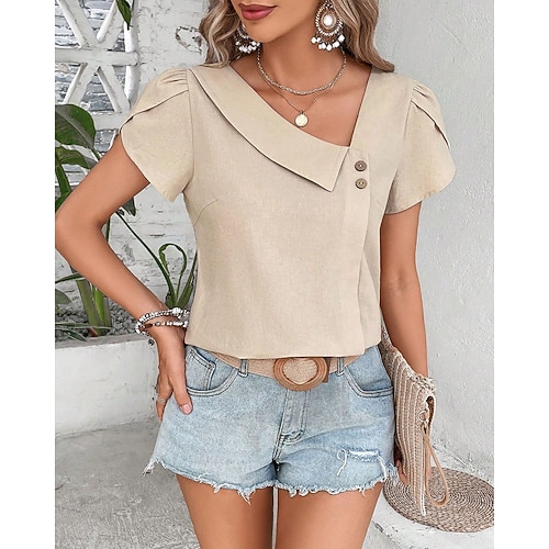 Per donna Maglietta Semplice Classico Casual Manica Corta Girocollo Top Regolari Quotidiano Uscire Weekend Volant Nero Bianco Verde chiaro Vino Estate Primavera
