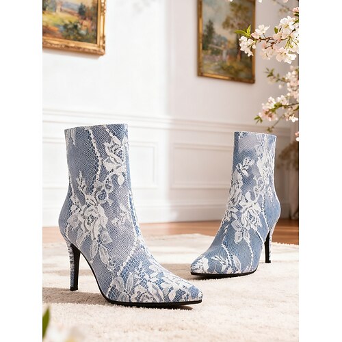stivaletti da donna con tacco alto e dettagli in pizzo, blu e bianco: elegante design in pizzo floreale, alla moda, perfetti per occasioni formali, feste e abiti da sera
