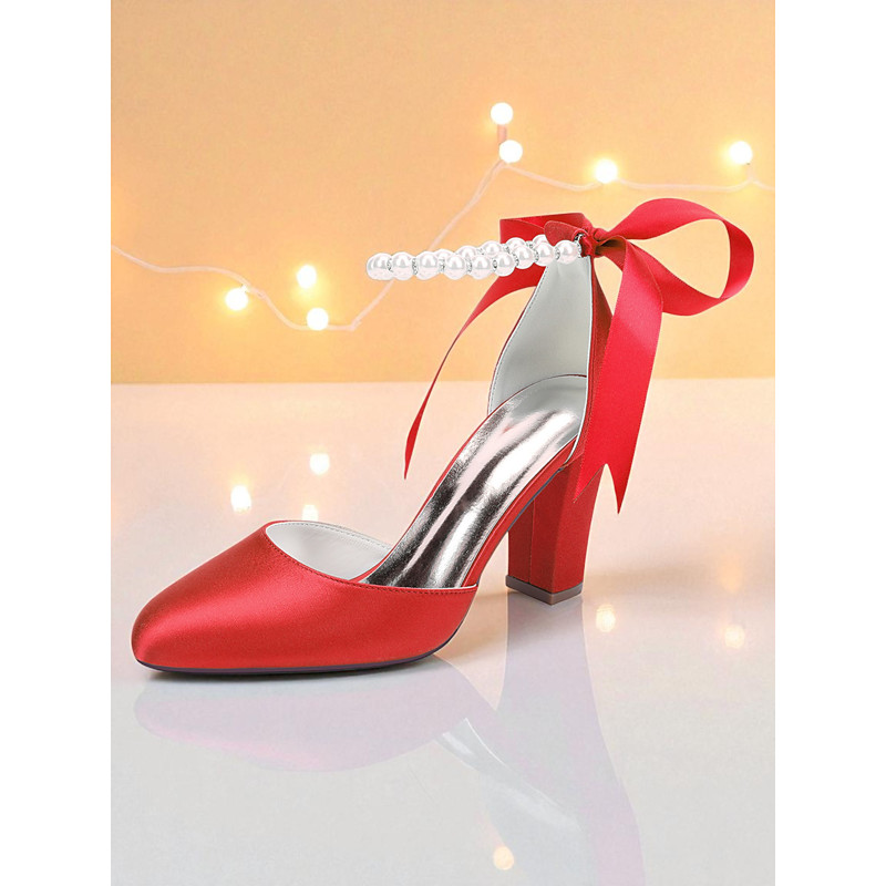 Women's Ivory Satin Bridesmaid Heels with Bow – Pointed Toe Ankle Strap Block Heel Wedding Shoes