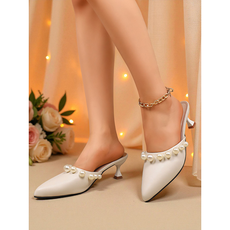 Women's White Pearl-Embellished Pointed-Toe Mules - Elegant Kitten Heel Wedding Party Shoes, Stylish Dressy Slides for Fashionable Women
