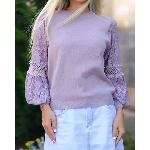 Per donna Felpa Maglione Streetwear Casual Tinta unica Girocollo Pizzo Patchwork Lavorato a maglia Manica Lunga Top Regolari Maglia Quotidiano Ferie Uscire Bianco Rosa Primavera