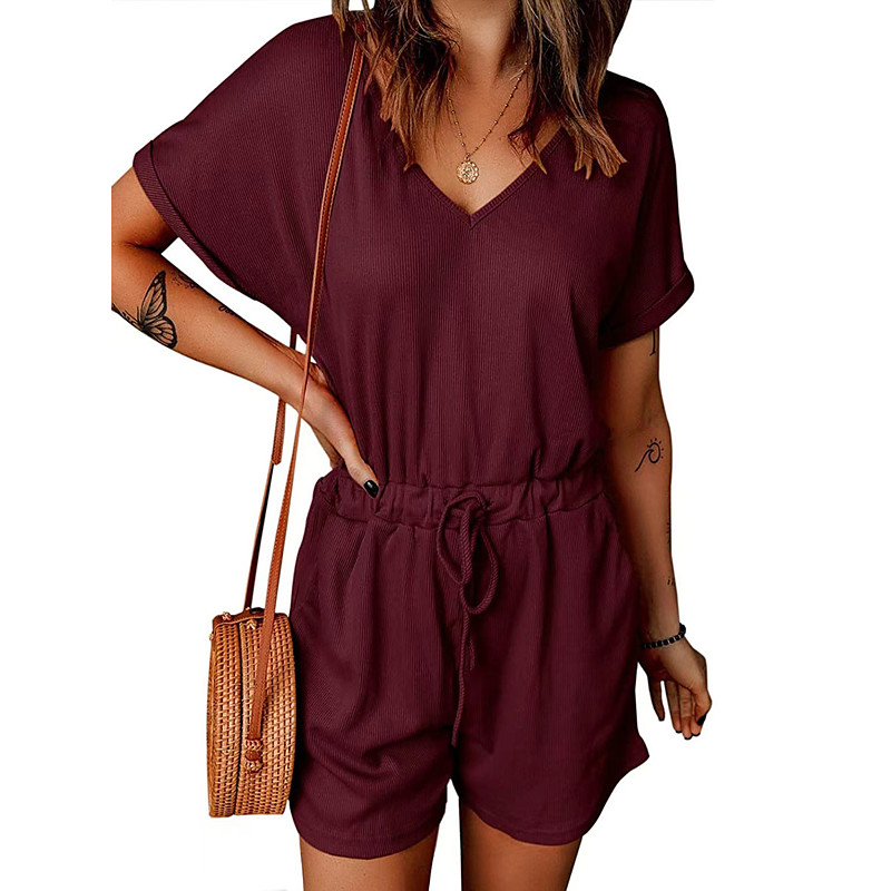 Women's Normal Romper Active Solid Color Short Sleeve Baggy Shorts V Neck Pocket Belted Daily Vacation Regular Fit Wine Navy Blue Purple Summer