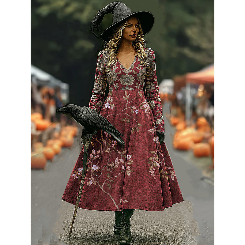 Women's Witch Print Maxi Dress A Line Dress Vacation Casual Boho Beach Regular Fit Floral Graphic Long Sleeve V Neck Deep Purple Black Pink Wine Spring Fall