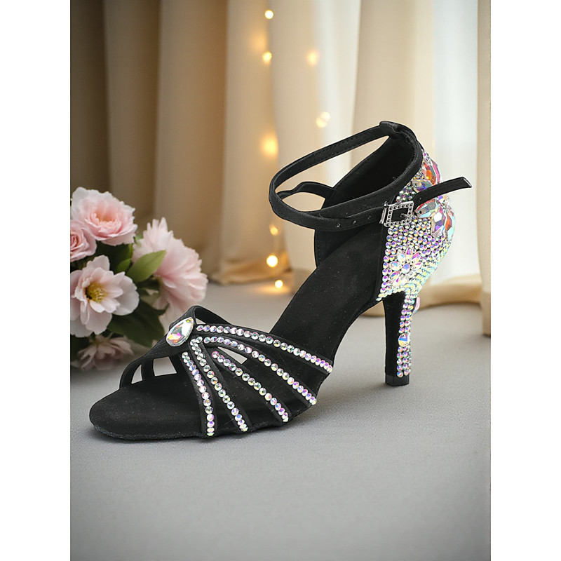 Women's Latin Dance Shoes with Rhinestone Crystals - Professional Ballroom Salsa Tango Heels with Ankle Straps for Performance and Competition