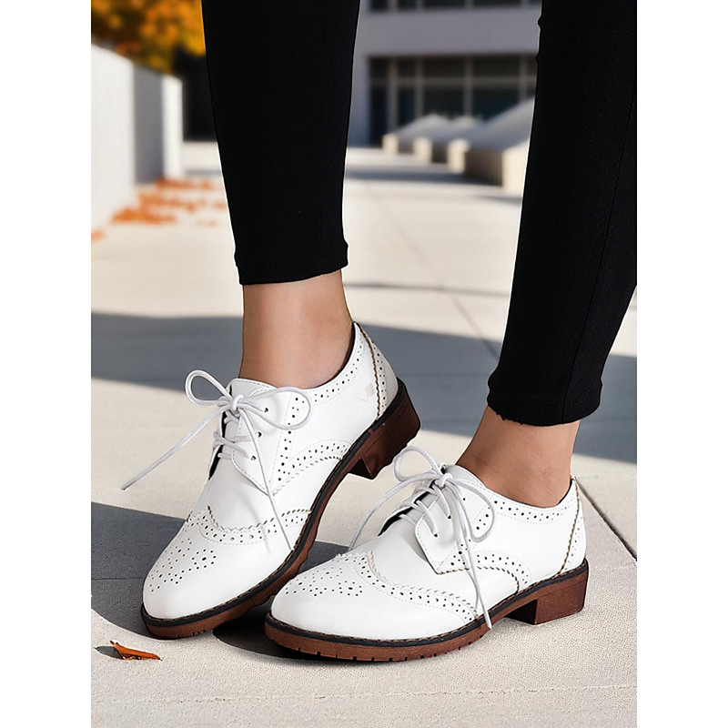 Women's Brown Faux Leather Brogue Oxford Shoes – Classic Wingtip Lace-Up Flats for Work, Daily Office Wear and Fall Outings