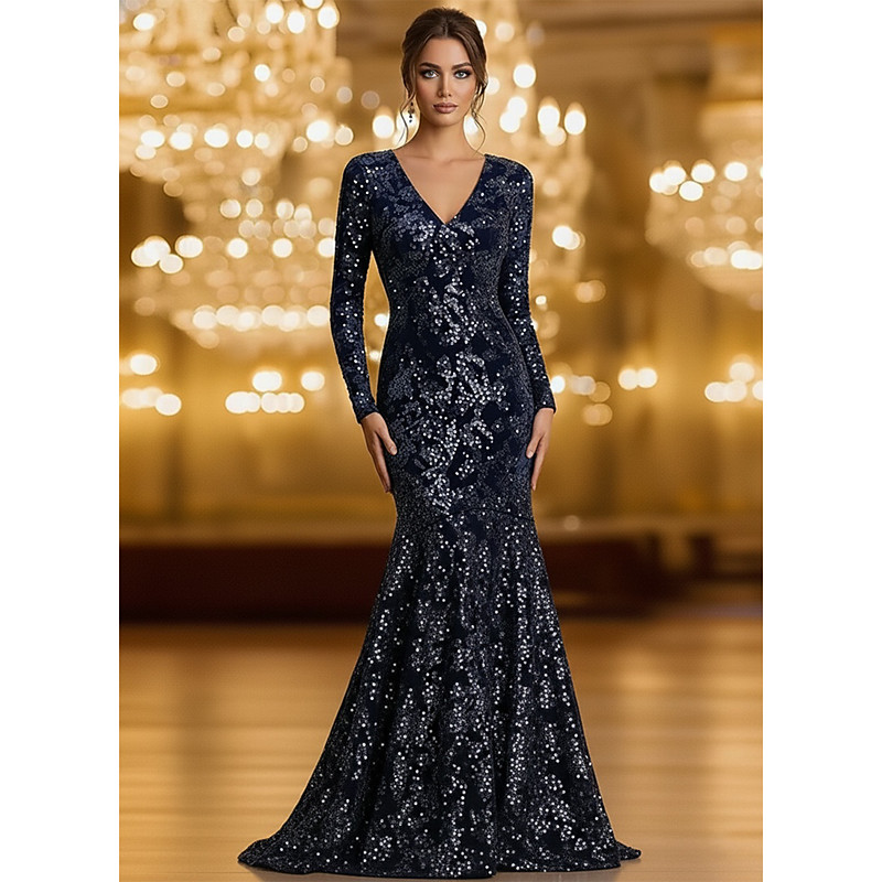 Mermaid Trumpet Sheath Column Floor Length Prom Dresses Evening Gown Ball Gown Formal Dress Elegant Celebrity Style Sparkle Long Sleeve V Neck Garden Party Wedding Sequined Stretch Crepe with Tassel