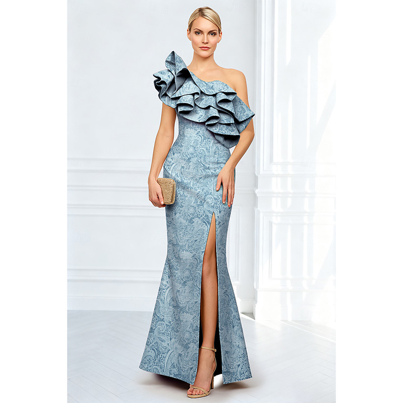 Mermaid Trumpet Floor Length Prom Dresses Evening Gown Ball Gown Formal Dress Elegant Vintage Sleeveless One Shoulder Wedding Formal Jacquard with Ruffles Slit