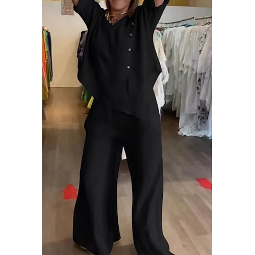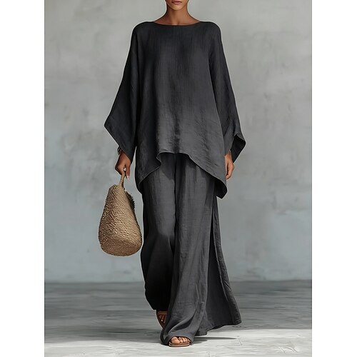 Per donna Set di Pantaloni Finto cotone e lino Manica Lunga Girocollo Tinta unica Moda Streetwear Casuale Quotidiano All'aperto Nero Bianco Vino Primavera Estate Vestibilità comoda