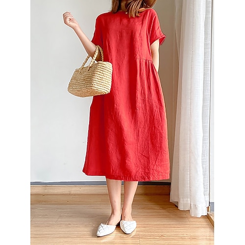 Per donna Abito Midi Finto cotone e lino Vestito Casual Elegante Moda Moderno Quotidiano All'aperto Vacanza Vestibilità comoda Semplice Manica Corta Girocollo Nero Bianco Rosso Blu marino Estate