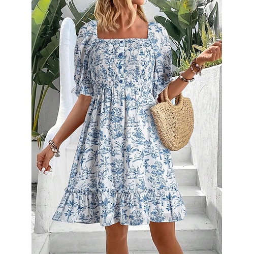 Per donna Abito al ginocchio Vestito Casual Abito Floreale Abito Stampato Elegante Moda Moderno Manica a Palloncino All'aperto Vacanza Uscire Vestibilità comoda Floreale Manica Corta Collo quadrato