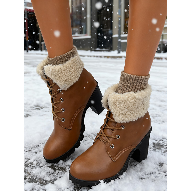 Women's Brown Lace-Up Ankle Boots with Faux Shearling Cuffs – Warm and Cozy Winter Style for Snowy Weather, Casual Outings and Winter Travel