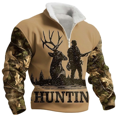 Herren Tiermotiv Hirsch Fleece Pullover Mode Lässig 3D Stehkragen Viertelreißverschluss Outdoor Streetwear Urlaub Geschenk Braun Khaki Dunkelgray Grau Halber Reißverschluss Herbst Winter Designer S M