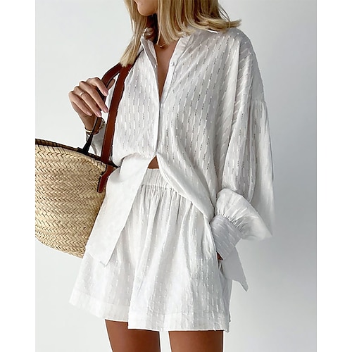 Per donna Streetwear Camicie di cotone e lino Blusa Set di Pantaloni Manica Lunga Girocollo Tinta unica All'aperto Vacanza Nero Bianco Rosso Estate Vestibilità regolare