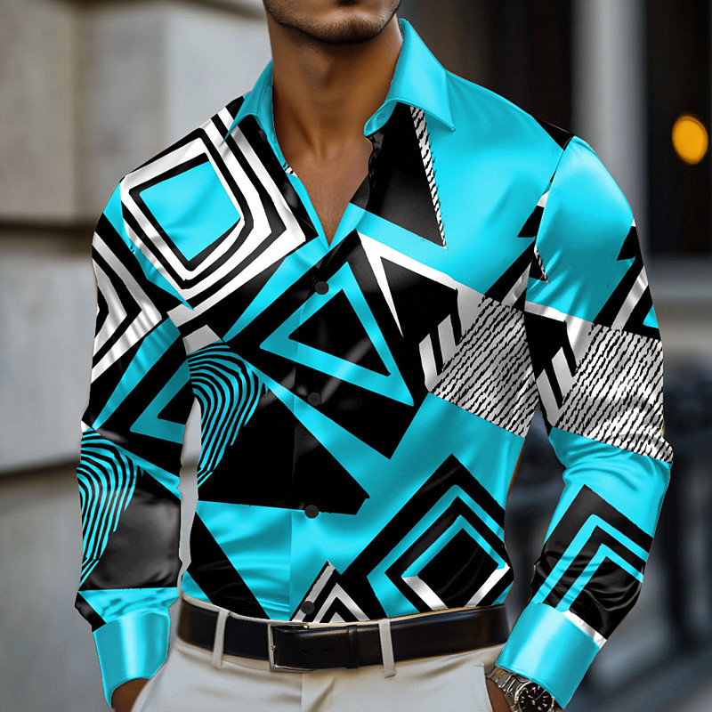 Men's Geometric Color Block Grid / Plaid Shirt Satin Shirt Dress Shirt Long Sleeve Fashion Casual Vacation Dailywear Summer Spring Fall Turndown 3D Print Button Up Shirts Red Blue Green Dark Blue