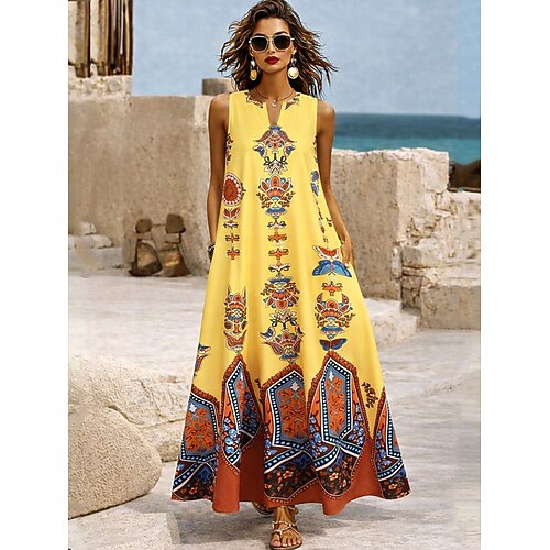 Per donna Abito maxi Vestito Estivo Abito a trapezio Abito Estivo Vacanza Casual Boho Quotidiano Ferie Vestibilità comoda Grafico Tribale Senza Maniche Scollo a V All'americana Blu Nero Giallo Estate