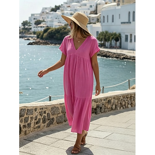 Per donna Abito Midi 100% cotone Abito in cotone e lino Moda Moderno All'aperto Vacanza Ferie Vestibilità comoda Semplice Manica Corta Scollo a V Blu Nero Bianco Verde chiaro Estate Primavera
