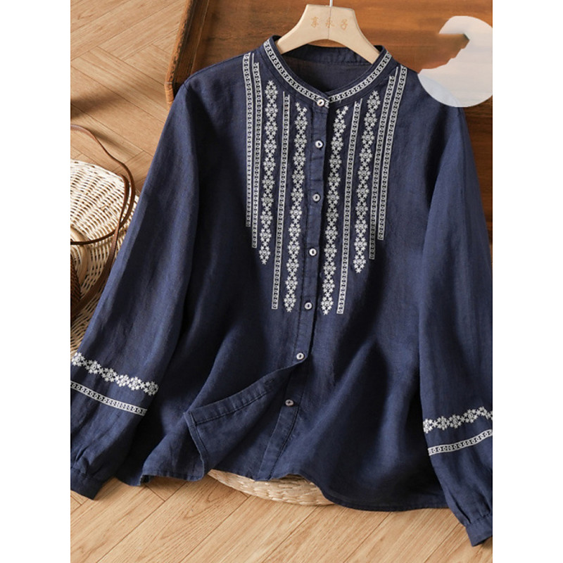 Women's Blouse Solid Color Stylish Casual Long Sleeve Mandarin Collar Regular Tops Daily Embroidered White Pink Navy Blue Orange Spring Fall