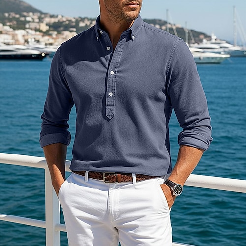 Per uomo Camicia Camicia button-down Camicia casual Semplice Casuale All'aperto Blu chiaro Nero Bianco Blu marino Manica Lunga Colletto italiano visibile Estate Primavera Abbigliamento Bottoni