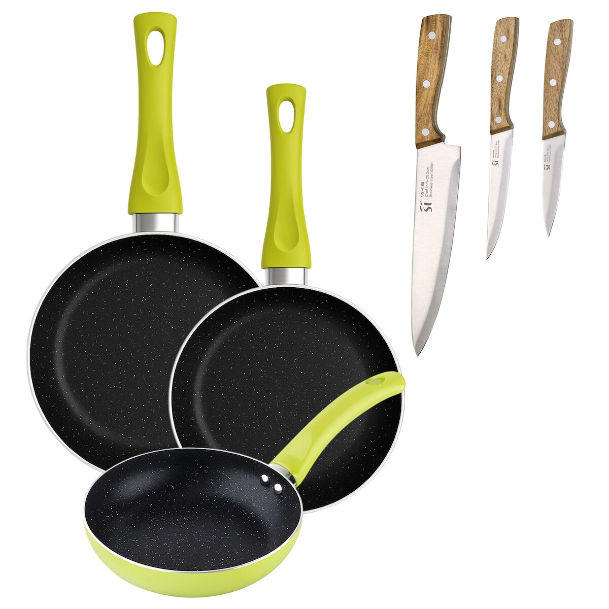 BERGNER - Set aus 3 Pfannen Ø20/Ø24/Ø28 cm gepresstes Aluminium Molen Grün 3-teiliges Edelstahlmesser-Set mit Messerblock