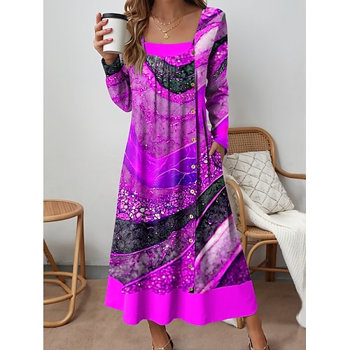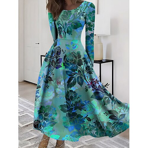 Per donna Abito Midi Abito a trapezio Abito aderente e svasato Vacanza Casual Quotidiano Vestibilità regolare Floreale Grafico Manica Lunga Girocollo Giallo Blu Viola Verde Primavera Autunno Inverno