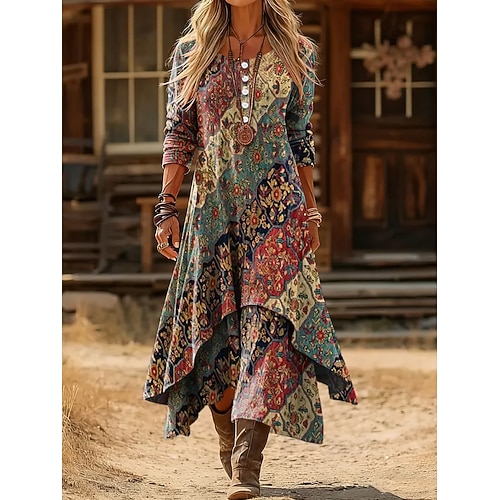 Per donna Abito Midi Vestito Estivo Abito a trapezio Vacanza Casual Boho Uscire Spiaggia Vestibilità comoda Grafico Geometrico Manica Lunga Scollo a V Rosa Blu Viola Verde Primavera Autunno Inverno