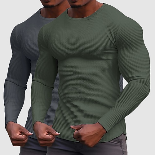 Herren Waffelhemd T Shirt T-Shirt Langarmshirt Langarm Rundhalsausschnitt Frühling Herbst Ganzjahres Einfach Mode Designer Basic 2 teilig Mehrfachpackung Gestrickt Urlaub Straße Lässig