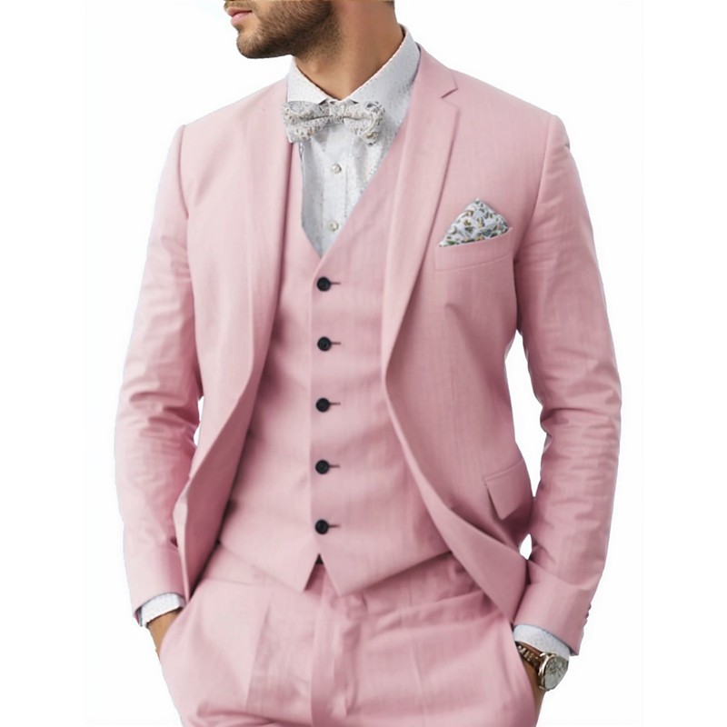 Men's Wedding Linen Suits Notch Light Blue Pink Solid Colored Tailored Fit 3 Piece Single Breasted Two-buttons