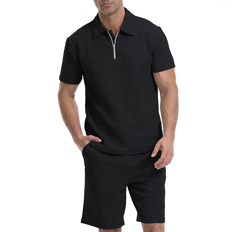 Men's Waffle Tracksuit Polo Shirt Shorts Set Outfit Set Polo Collar Quarter Zip Outdoor Daily Sports Pocket Drawstring 2 Piece Plain Black White Khaki Polyester Activewear Classic Casual Summer