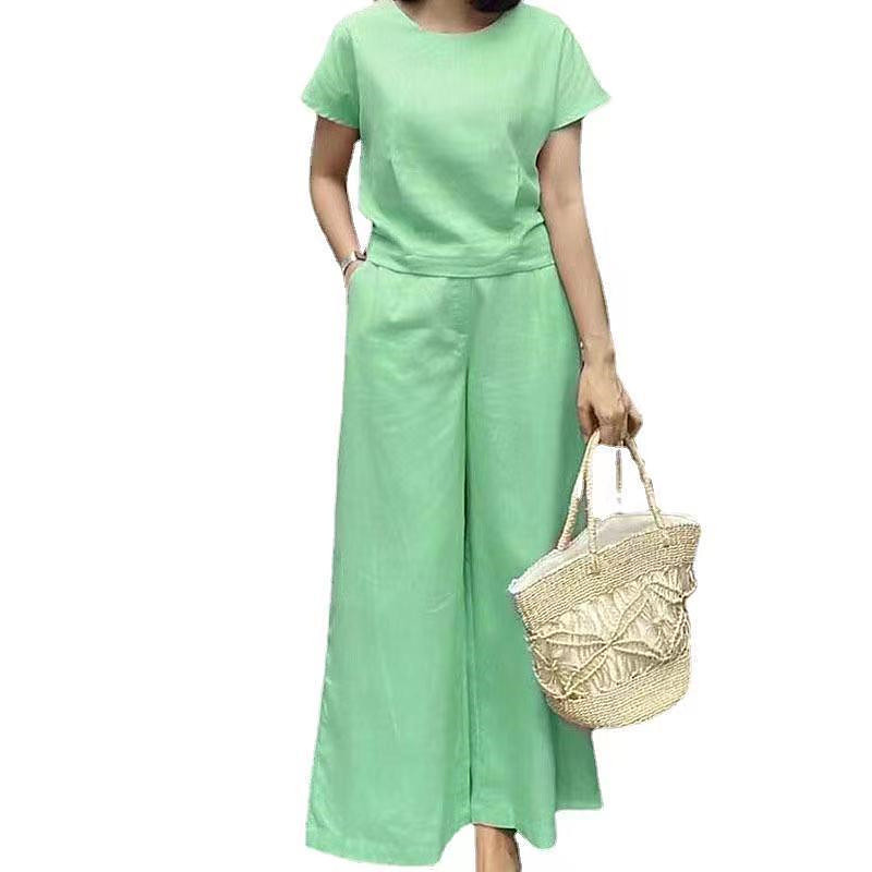 Women's Fashion Streetwear Shirt Cotton Linen Sets Two Piece Sets Short Sleeve Crew Neck Plain Daily Wear Date Yellow Pink Green Summer Regular Fit
