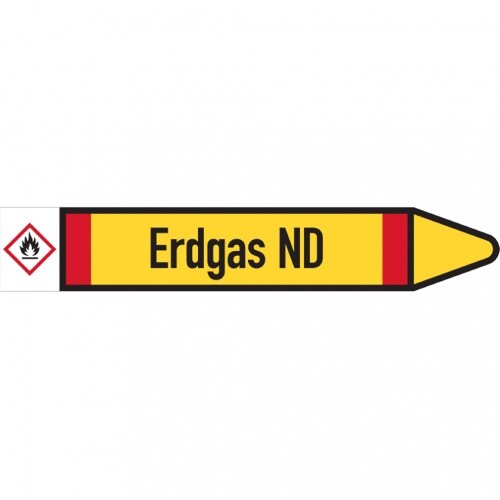 Dreifke® Rohrleitungskennzeichen-Etikett Erdgas ND, rechts, DIN, gelb/schwarz/rot, für Ø 60-90mm, 310x52mm, 3/Bogen