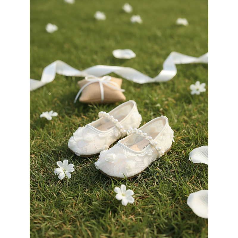 Kid's Lace Pearl Strap Mary Jane Flats with Floral Appliqué, Elegant Princess Style Wedding Flower Girl Shoes for Little Girls, Comfortable Low Heel Dress Shoes for Ceremonies