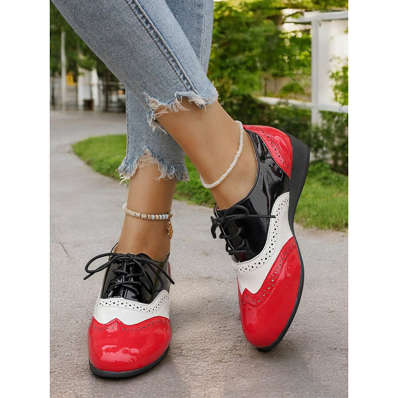 Black Patent Leather Lace-Up Oxford Shoes with Brogue Detailing and Low Wedge Heel for Work and Formal Events