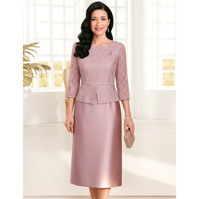 Sheath Column Knee Length Wedding Guest Dress Mother of the Bride Dress 3/4 Length Sleeve Jewel Neck Vintage Plus Size Wedding Guest Satin Lace Jacket Dresses with Appliques