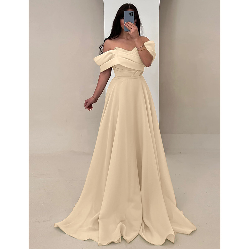 A-Line Asymmetrical Floor Length Evening Gown Ball Gown Formal Dress Elegant Silky Half Sleeve Crew Neck Wedding Formal Champagne Mother Of the Bride Dress Stretch Satin with Pocket