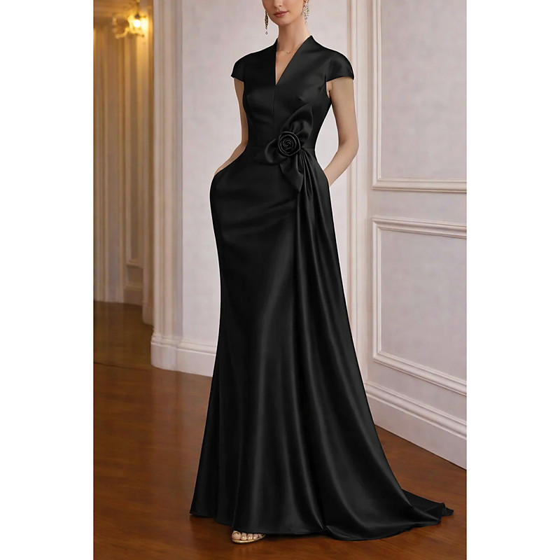 A-Line Floor Length Evening Gown Ball Gown Formal Dress Elegant Silky 3/4 Length Sleeve Shirt Collar Wedding Formal Pocket Stretch Satin with Shouder Flower