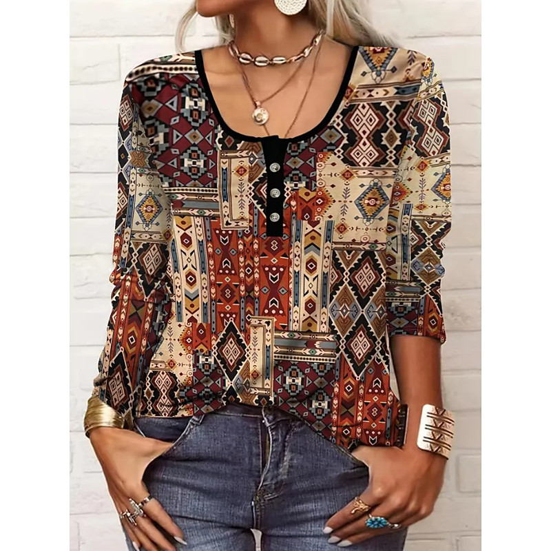 Women's Tunic T Shirt Floral Graphic Geometric Stylish Casual Boho Long Sleeve Crew Neck Regular Tops Daily Going out Weekend Black Red Orange Brown Khaki Fall Winter