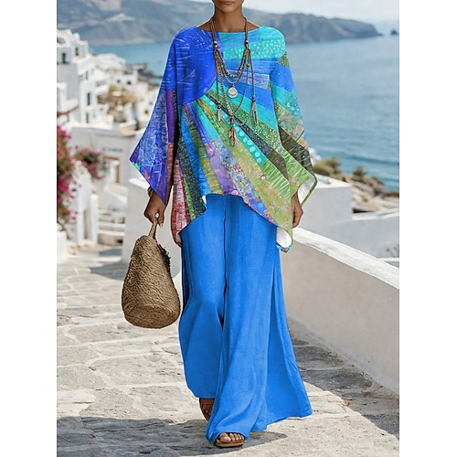 Per donna Set di Pantaloni Manica 3/4 Girocollo Grafico Geometrico Stampato Moda Streetwear Casuale Quotidiano All'aperto Blu Viola Arancione Estate Vestibilità comoda