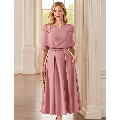 Abito da festa A-Line fino al tè Abito da cocktail Abito da ospite per matrimoni Abito per la madre della sposa con maniche a metà e collo rotondo elegante vintage con pieghe e ricami
