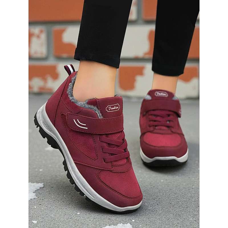 Women's Burgundy Warm Sneakers - Fleece Lined Non-Slip Winter Walking Shoes, Lightweight Casual Lace-Up Footwear for Outdoor and Travel Wear
