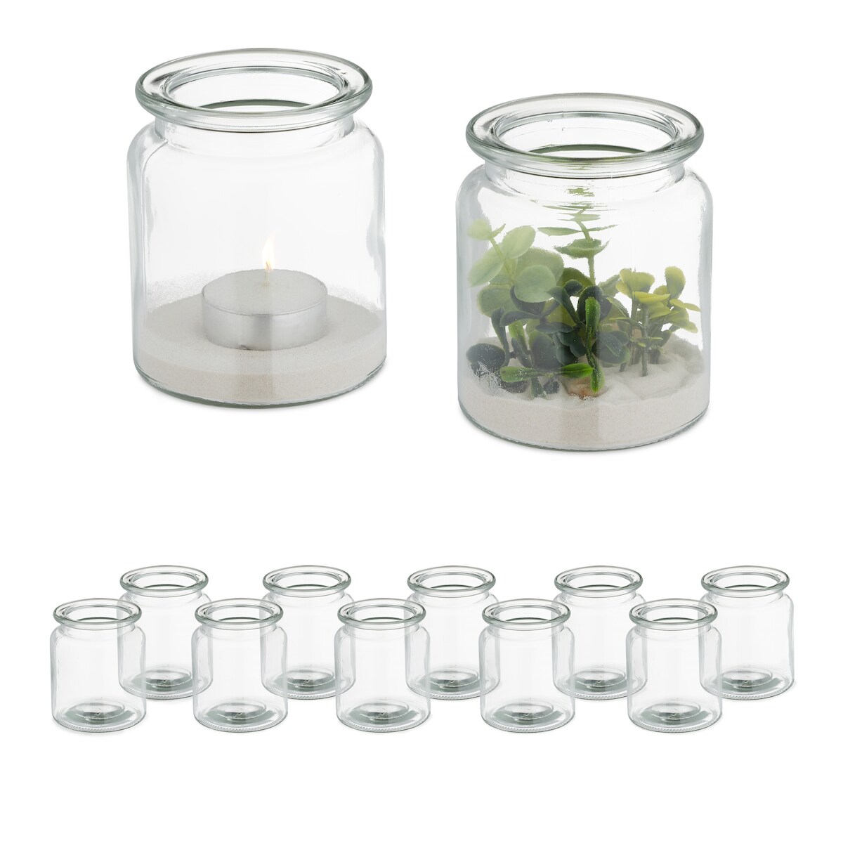 Relaxdays Windlicht, 12er Set, aus Glas, innen & außen, HxD: 9,5 x 8 cm, runde Teelichthalter, Hochzeit, transparent