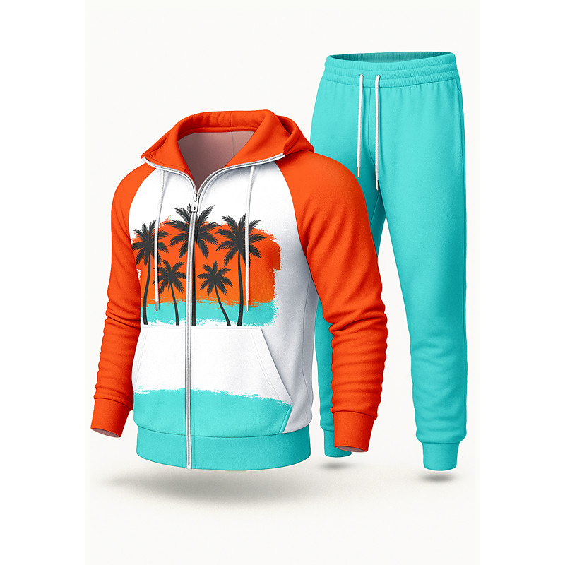 Men's Hoodie Tracksuit 2 Piece Tracksuit Drawstring Zip Up Trees / Leaves Clothing Suit Fall Orange Vocation Outdoor Travel Lightweight Fashion Long Sleeve Sport Activewear Stretchy Regular Fit