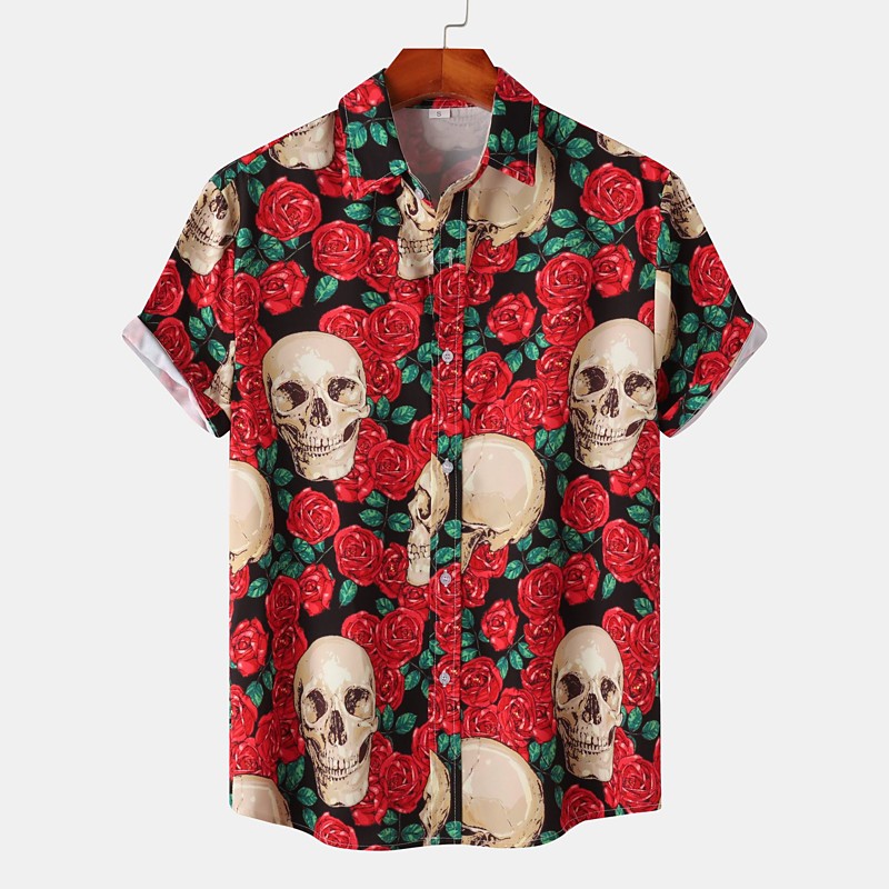 Men's Skulls Flowers Shirt Summer Shirt Casual Shirt Short Sleeves Vintage Horror Vacation Daily Wear Theme Party Spring Summer Lapel Print WhiteBlack Black White Red Blue