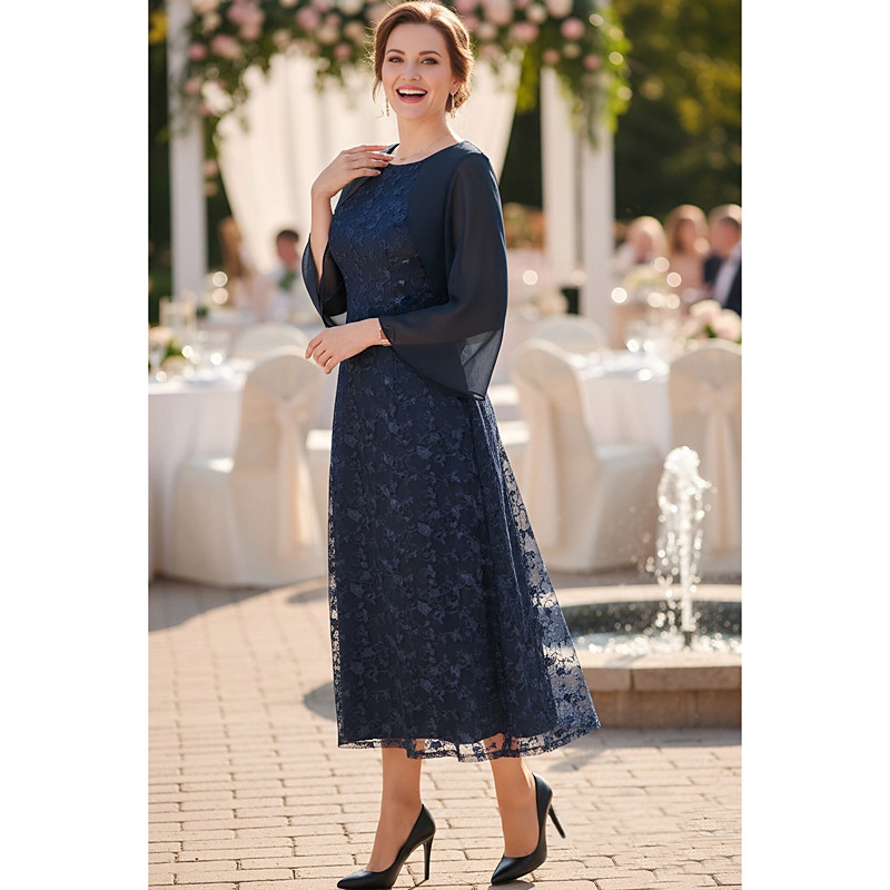A-Line Tea Length Party Dress Cocktail Dress Wedding Guest Dress Mother of the Bride Dress 3/4 Length Sleeve Crew Neck Elegant Wedding Guest Engagement Party Chiffon Lace with Lace Pleats